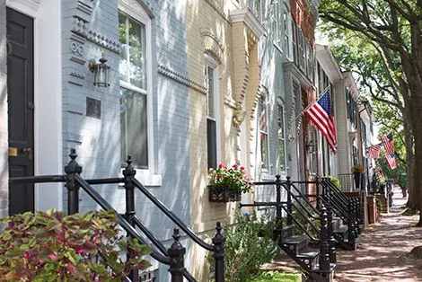 17th-century row houses, colonials, modest bungalows, revival mansions, and modern condos.